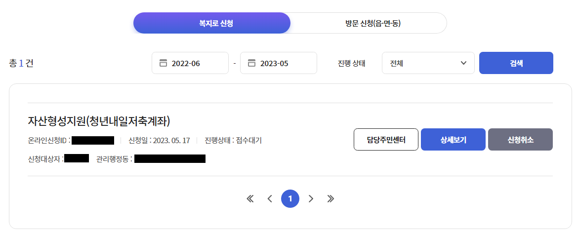 저는 첨부서류로 재직증명서와 기타 부채증빙서류를 제출하였습니다. 그럼 자산형 선지원으로 온라인신청 ID가 발급되고, 진행상태가 표기되고 관리행정동도 표기가 됩니다. 자신이 제출한 서류가 빠르게 처리가 되는지 아니면 불가판정을 받았는지 또는 더욱 자세한 청년내일저축계좌에 대한 내용을 알고 싶으시다면 가까운 읍면동 주민센터에 방문을 하시어 물어보면 될 것 같습니다.