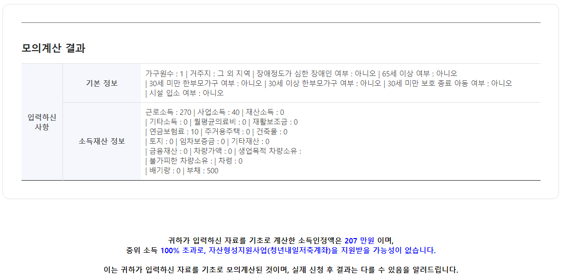 예로 월소득 270만 원, 사업소득 월 40만 원 국민연금 10만 원, 부채 500만 원으로 모의결과를 진행해 보니 소득인정액은 207만 원이 나왔습니다. 대한민국 1인가구 중위소득 100%는 207만 7,892원으로 신청이 가능했습니다.