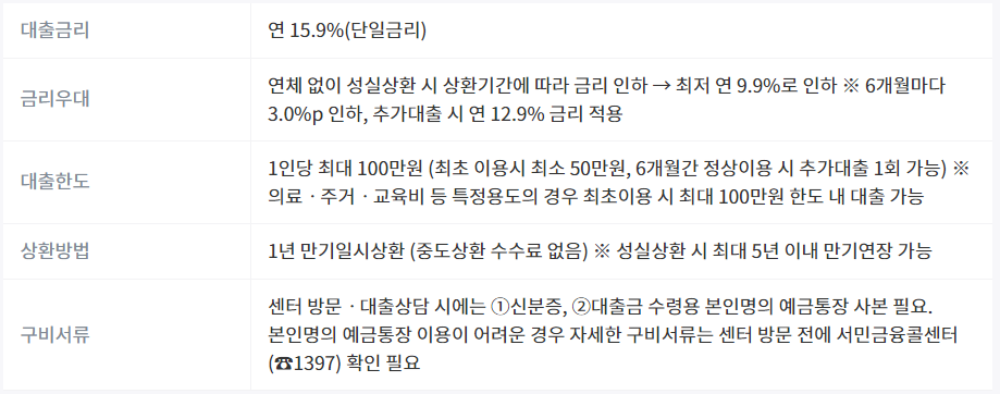 15,9%의 높은 금리이지만, 연체 없이 성실상환 시 상환기간에 따라 금리 인하를 적용받을 수 있습니다. 최저 9.9%까지 인하될 수 있으며, 6개월마다 3% p가 인하됩니다. 다만, 최초 50만 원을 지원받고 추가 50만 원을 지원받게 되면 12.9%의 금리가 적용되니 참고부탁드립니다.